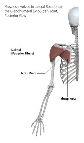 The muscles that act to produce lateral rotation at the shoulder joint are teres minor, deltoid (posterior fibers) and infraspinatus.