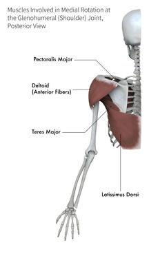 The muscles that act to produce medial rotation at the shoulder joint are pectoralis major, deltoid (anterior fibers), latissimus dorsi, teres major and subscapularis.
