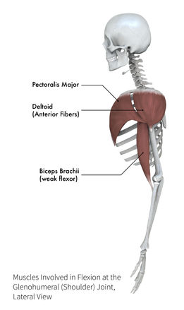 The muscles that act to produce flexion of the shoulder are the deltoid (anterior fibers), pectoralis major (clavicular head) and coracobrachialis. The biceps brachii muscle is also a weak flexor of the shoulder.